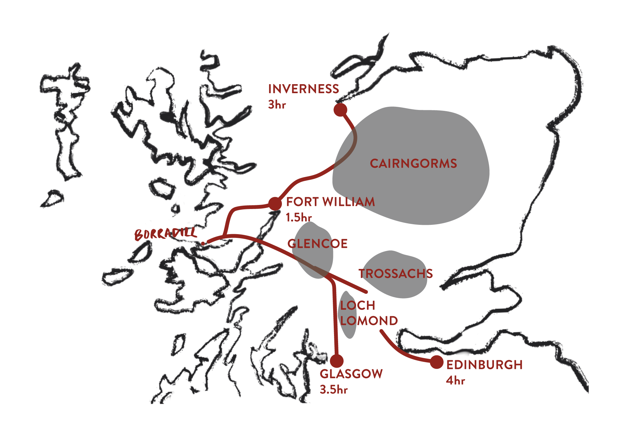 You can drive from Edinburgh to Borradill in about 4.5 hours, through all of the glorious landscapes that the Scottish Highlands have to offer – from the Trossachs National Park and the elegant estates of Perthshire to the wilds of Rannoch Moor and Glencoe.
